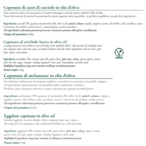 Caponata di Carciofi: Carciofi 70%, olive verdi (8%), passata di pomodoro (8%), PINOLI, SEDANO, capperi, cipolla, carota, olio d’oliva, sale, zucchero, aceto, menta, origano, aglio, peperoncino. Correttore di acidità: acido citrico