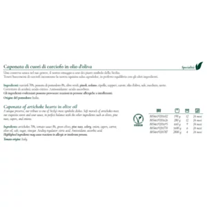 Carciofi 70%, olive verdi (8%), passata di pomodoro (8%), pinoli, sedano, capperi, cipolla, carota, olio d’oliva, sale, zucchero, aceto, menta, origano, aglio, peperoncino. Correttore di acidità: acido citrico.