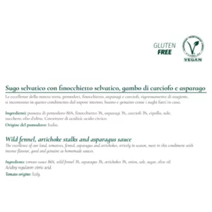 Scopri il nostro sugo di pomodoro, arricchito con finocchietto selvatico, gambi di carciofi e asparagi. Questo condimento per la pasta è una vera delizia prodotta con passione artigianale e ingredienti naturali di altissima qualità.