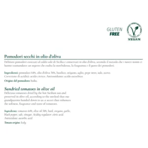 Pomodori 62%, olio d’oliva 35%, basilico, origano, aglio, pepe nero, sale, aceto. Correttore di acidità: acido citrico. Antiossidante: acido ascorbico. Origine del pomodoro: Italia