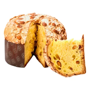 Farina di FRUMENTO, acqua, zucchero, tuorlo d'UOVO fresco, BURRO fresco 30% min., uva sultanina 15%, cubetti di arancia extra canditi naturali e senza conservanti, 3% (scorze di arance, sciroppo di glucosio, fruttosio, saccarosio), cubetti di cedro canditi naturali e senza conservanti 3% (cedro, sciroppo di glucosio e fruttosio. saccarosio, correttore di acidità: acido citrico E330), MANDORLE, lievito di birra, lievito in polvere, malto, miele, sale, vanillina, aromi naturali.