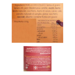 Colomba: farina di GRANO TENERO 00, pere Madernassa candite, TUORLO, BURRO, lievito naturale, zucchero, burro di cacao, cacao, sale, estratto naturale di vaniglia. Glassa: zucchero, NOCCIOLE, ALBUME. Contiene FRUTTA CON GUSCIO. Zabaione: Marsala fine I.P. secco D.O.C. 40%, zucchero, UOVA pastorizzate e omogenizzate, amido di riso, vaniglia in bacche.