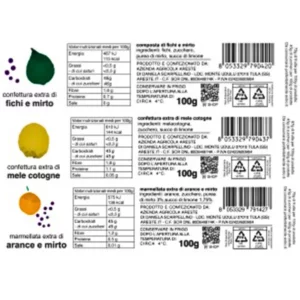 Confettura extra di fichi e mirto 230g: fichi, zucchero, liquore di mirto, succo di limone.