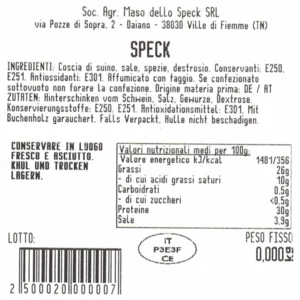 DESCRIZIONELo Speck Tradizionale viene prodotto con le parti scelte del cosciotto di maiale e rappresenta una sintesi perfetta di sapori, ma anche di profumi, tipici della tradizione.