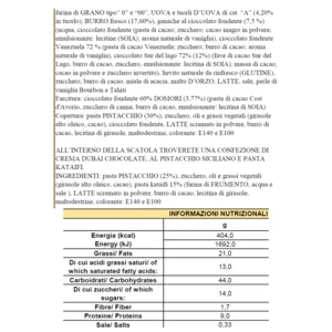 INGREDIENTI: pasta PISTACCHIO (25%), zucchero, oli e grassi vegetali (girasole alto oleico, cacao), pasta kataifi 15% (farina di FRUMENTO, acqua e sale ), LATTE scremato in polvere, burro di cacao, lecitina di girasole, maltodestrine, colorante: E140 e E100
