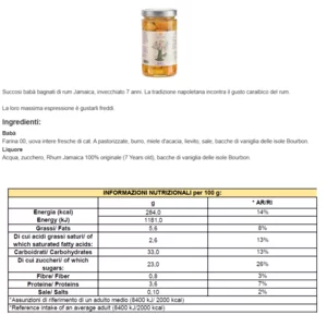 Preparato con ingredienti di alta qualità: farina tipo 00, uova fresche pastorizzate, burro e miele d’acacia, viene bagnato con rhum giamaicano originale invecchiato 7 anni, dal profumo profondo e dal gusto caldo e avvolgente.