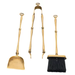 Servizio da camino in ottone lucido artigianale, 3 accessori, h59cm