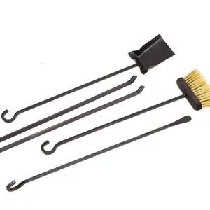 Il set comprende paletta, molla in unico pezzo, attizzatoio forgiato e scopina intercambiabile in ottone (non brucia), tutti realizzati in ferro quadro e rifiniti artigianalmente.