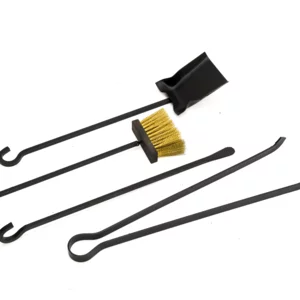 Servizio con sostegno battuto a caldo e forgiato artigianalmente, dotato di asta centrale con base tonda. Include 4 accessori, tutti eseguiti con ferro quadrato: paletta, molla unico pezzo, attizzatoio forgiato e scopina intercambiabile in ottone, che non brucia.