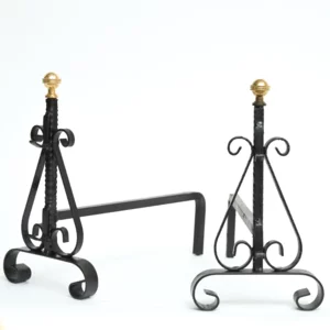 Il servizio comprende 4 accessori: paletta, molla monopezzo, attizzatoio forgiato e una scopina intercambiabile in ottone, resistente al calore e offerta in omaggio esclusivo per i clienti del sito. La coppia di alari riprende lo stesso decoro e include supporti per spiedini e terminale con pomo in ottone, per un set funzionale e decorativo.