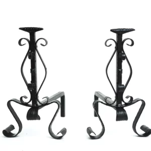 Il servizio è completo di 4 accessori funzionali: paletta, molla in unico pezzo, attizzatoio e scopina intercambiabile in ottone (non brucia), tutti perfettamente integrati nel sostegno decorato. La coppia di alari riprende il motivo forgiato, con proporzioni perfette per camini di medie dimensioni.