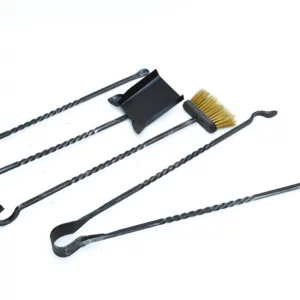 Il servizio comprende 4 accessori essenziali – paletta, molla monopezzo, attizzatoio forgiato e scopina intercambiabile – mentre la scopina in ottone resistente al calore è fornita in omaggio esclusivo per i clienti del sito. A completare il set, la coppia di alari forgiati con decoro coordinato, pensata per offrire supporto alla legna e un tocco estetico distintivo.