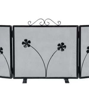 Parascintille artigianale in ferro battuto forgiato a mano, con sportelli apribili decorati a fiore e rifinitura nera sfumata argento applicata a pennello.
