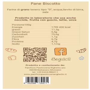 Realizzato dal Panificio Pasticceria Righetto con una lavorazione artigianale, questo pane viene cotto due volte per ottenere una consistenza particolarmente croccante e fragrante.