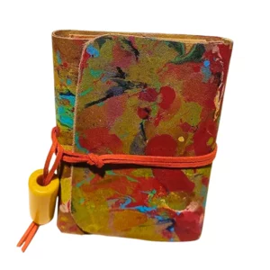 La pelle che la riveste è lavorata con l’antichissima tecnica Ebru della marmorizzazione, cosicché ogni pezzo ha un carattere unico e irripetibile, con colori e motivi astratti e fluidi, mai identici l’uno all’ altro.