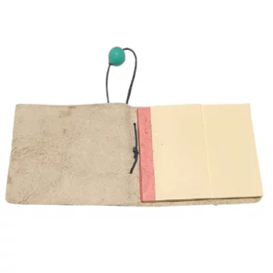 Le caratteristiche principali di questo taccuino sono quelle di recuperare materiali in disuso come pelle di scarto di lavorazioni calzaturiere poi legate e abbellite in maniera originale grazie all’uso di pietre o elementi di vecchie collane.