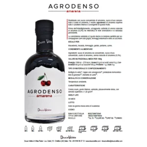 Questo agrodenso di amarena è realizzato con succo di amarena da concentrato, succo d’uva concentrato e aceto di amarena.
