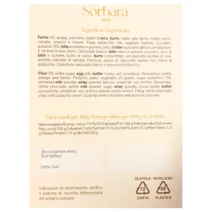 Farina 00, acqua, zucchero, tuorlo d'uovo, burro, miele, sale, lievito madre. aromi: vaniglia, arancio e limone. Pasta pistacchio: olio vegetale (palma), zucchero, pistacchi 15%, latte scremato in polvere, siero di latte in polvere, lattosio, emulsionanti: lecitina di soia, aromi.