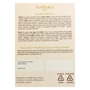 Acqua, aromi: vaniglia, arancio e limone, burro, farina 00, lievito madre, miele, sale, tuorlo d'uovo, zucchero.