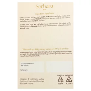 Farina 00, acqua, zucchero, tuorlo d'uovo, burro, miele, sale, lievito madre. aromi: vaniglia, arancio e limone. Mandorle, sciroppo di glucosio, amido di riso. Farcitura: uvetta. Decorazione: mandorle, zucchero.