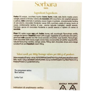 L’impasto soffice accoglie crema alle nocciole 24%, gocce di cioccolato fondente e canditi d’arancio.