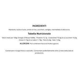 Mandorle, tuorlo d'uovo, amido di riso, zucchero, vaniglia, marmellata di albicocca.