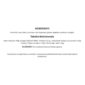 Farina 00, uova intere, zucchero, olio di girasole, grasso vegetale, sambuca, vaniglia.