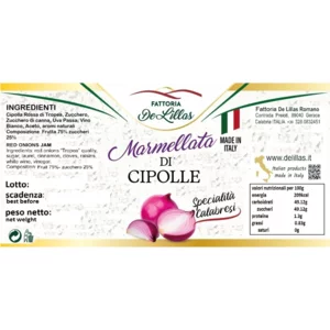 Cipolla rossa di Tropea, zucchero, zucchero di canna, uva passa, vino bianco, aceto, aromi naturali.