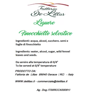Il Liquore al finocchietto selvatico di Fattoria De Lillas è un liquore artigianale ottenuto dalla lavorazione del finocchietto che cresce spontaneo nelle aree collinari della Calabria, dove la pianta sviluppa un profilo aromatico intenso e naturale.