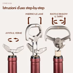 ALTA QUALITA ': Realizzato in materiale di acciaio inossidabile di alta qualità, non tossico, ecologico, sicuro e durevole da usare. Ergonomico ad una size-fits-Tutto il design: Il nostro apribottiglie è progettato ergonomicamente per un comodo e confortevole da impugnare quando lo si utilizza, a chiunque di rimuovere facilmente il sughero fuori le loro bottiglie preferite, lavoro di risparmio, facile da usare
