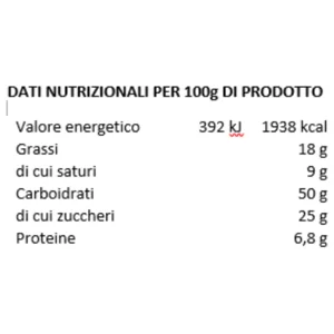Valori nutrizionali per 100g: Valore energetico: 392kj/1938kcal. Grassi 18g di cui saturi 9g. Carboidrati 50g di cui zuccheri 25g. Proteine 6,8g.