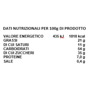 Grassi 21g di cui saturi 11g. Carboidrati 54g di cui zuccheri 35g. Proteine 7,0g. Sale 0,4g.