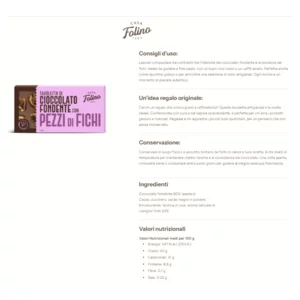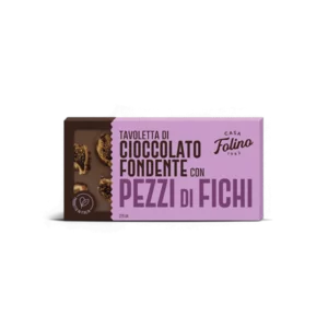 I fichi, inseriti in pezzi generosi, aggiungono una nota fruttata e croccante che si bilancia perfettamente con il gusto deciso del fondente. Un prodotto ideale per una pausa golosa, da gustare lentamente.