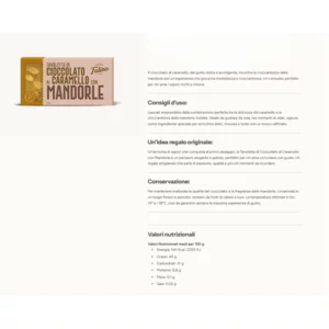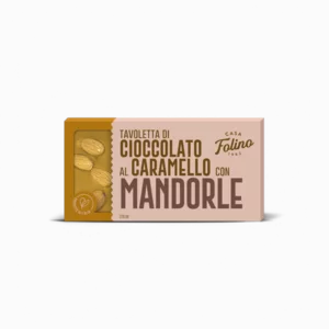 Una tavoletta che unisce la golosità del cioccolato al caramello e la croccantezza delle mandorle intere, per un gusto deciso e avvolgente. Casafolino produce questo prodotto artigianale, con i migliori ingredienti, lavorati secondo la tradizione dolciaria italiana.