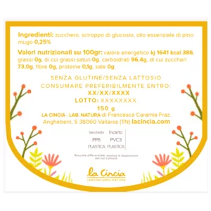 zucchero, sciroppo di glucosio, olio essenziale di pino mugo