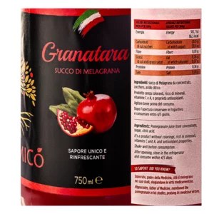 Ingredienti: succo di Melagrana da concentrato 45%, zucchero, acido citrico.