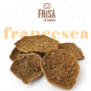 La frisella artigianale Francesca nasce da una miscela ricca e naturale: farina di grano tenero tipo 0, cereali integrali al 72% e lievito madre, per una fragranza autentica e una consistenza rustica.