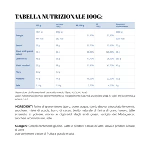 Valore energetico: 441kcal/1841kJ. Grassi: 25g di cui Acidi Grassi Saturi: 16g. Carboidrati: 46g di cui Zuccheri: 25g. Fibre: 0,8g. Proteine: 7,5g. Sale: 0,16g.