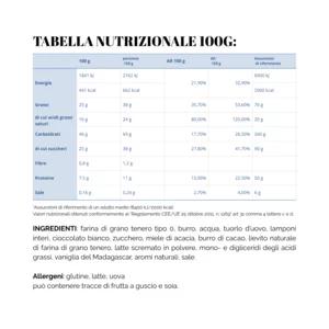 Farina di grano tenero tipo 0, burro, acqua, tuorlo d’uovo, lampone semi-candito, cioccolato bianco, zucchero, miele di acacia, burro di cacao, lievito naturale di farina di grano tenero, latte scremato in polvere, mono di-gliceride degli acidi grassi, vaniglia del Madagascar, zuccheri e aromi naturali, sale.