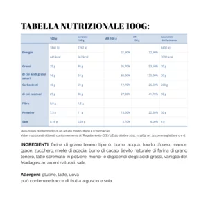 Farina di grano tenero tipo 0, burro, acqua, tuorlo d’uovo, marron glacé candito, zucchero, lievito naturale di farina di grano tenero, latte scremato in polvere, mono e di-gliceride degli acidi grassi, vaniglia del Madagascar, zuccheri e aromi naturali, sale.