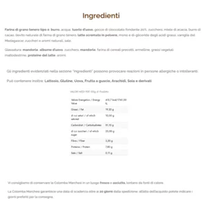 Glassatura: mandorle, albume d’uovo, zucchero, mandorle, farina di cereali precotti, armelline, grassi vegetali maltodestrine, proteine del latte, aromi.