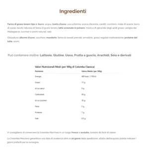 Glassatura: albume d’uovo, zucchero, mandorle, farina di cereali precotti, armelline, grassi vegetali maltodestrine, proteine del latte, aromi.