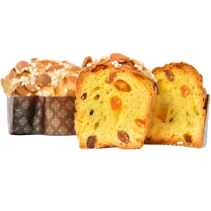 Farina di grano tenero tipo 0, burro, acqua, tuorlo d’uovo, uva sultanina, scorza d’arancia, canditi, zucchero, miele di acacia, burro di cacao, lievito naturale di farina di grano tenero, latte scremato in polvere, mono e di-gliceride degli acidi grassi, vaniglia del Madagascar, zuccheri e aromi naturali, sale.