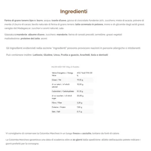 Farina di grano tenero tipo 0, burro, acqua, tuorlo d’uovo, gocce di cioccolato fondente 20%, zucchero, miele di acacia, polvere di menta 1%,burro di cacao, lievito naturale di farina di grano tenero, latte scremato in polvere, mono e di-gliceride degli acidi grassi, vaniglia del Madagascar, zuccheri e aromi naturali, sale.