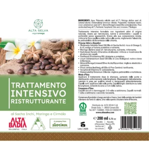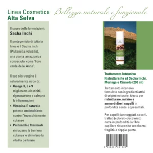 Formulato con Sacha Inchi (Plukenetia volubilis), pianta amazzonica conosciuta come “l’oro verde delle Ande”, questo trattamento intensivo ristrutturante è studiato per essere applicato dopo lo shampoo.