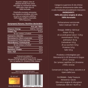 Questo olio extravergine di oliva greco proviene dalle olive Koroneiki , cultivar simbolo del Peloponneso , e rappresenta l'espressione più equilibrata della tradizione olearia locale.