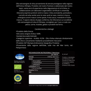 Dagli uliveti biologici della famiglia Oliorama su una piccola collina nell’area dell’antica Olimpia, a soli 3 km dal Mar Ionio, nasce questo olio extravergine di oliva Bio a bassa acidità. È un EVO biologico da raccolta precoce, pensato per preservare gli aromi del frutto fresco e la sua ricchezza in polifenoli (analizzati ogni anno dall’Università Capodistriana di Atene).