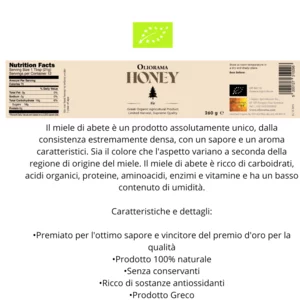 <p>Miele di abete dalla <strong>consistenza naturalmente molto densa</strong>, con <strong>gusto intenso</strong> e <strong>aroma caratteristico</strong>.</p><p>Colore e aspetto possono variare in base alla regione di origine. È naturalmente ricco di carboidrati, acidi organici, proteine, aminoacidi, enzimi e vitamine e presenta un basso contenuto di umidità.</p><p><strong>Provenienza:</strong> Grecia (Ilia – Pyrgos)<br><strong>Certificazione:</strong> <strong>Bio</strong> (GR-BIO-15 – Agriculture Greece. certificazione indicata in etichetta)<br><strong>Cristallizzazione:</strong> lenta<br><strong>Effetti benefici:</strong> alimento energetico naturale, ideale come dolcificante naturale<br><strong>Profilo sensoriale:</strong> molto denso. ambrato con riflessi perlacei. dolce delicato con note di caramello e lieve sentore di acero</p>
