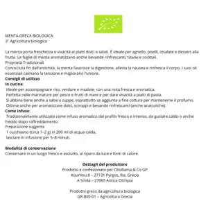La menta greca biologica ha un profilo aromatico fresco e intenso, perfetto per un infuso dal gusto vivace, da gustare caldo o anche freddo dopo raffreddamento.