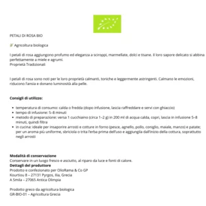 I petali di rosa greci biologici (varietà rosa damascena) sono un ingrediente raffinato, dal profumo floreale e dal gusto delicato, perfetto per aggiungere un tocco elegante a bevande e ricette.